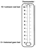 Verder ziet men op de vragenlijst een thermometer. Het is de bedoeling dat de patiënt een cijfer geeft dat het beste samenvat hoeveel last men de afgelopen week (inclusief vandaag) heeft gehad op praktisch, sociaal, lichamelijk en emotioneel gebied.